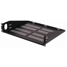 Vented Rack Shelf 2 Space Includes Mounting Screws Finish Powder Coated Color Black For Use With 19 in Equipment Racks Features Convenient tie down slots in rear of tray