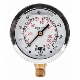 J1383 Pressure Gauge Lead Free 4 In. Basic Gauge Case Material Stainless Steel Basic Gauge Wetted Parts Brass / Bronze 1/4 In. MNPT Gauge Connection Location Bottom 0 to 160 psi +/-1.50 Percent Gauge Panel Mountable No Liquid Filled Yes Gauge Case Material 304 Stainless Steel Gauge Case Color Stainless Steel Calibration Certificate Included No