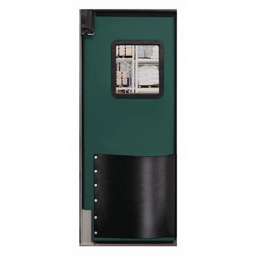 H1814 Swinging Door Door Height 7 ft. Door Width 2 ft 6 In. Door Color Forest Green Swinging Door Material Polyethylene Textured (Polyethylene Eggshell) Finish Door Thickness 1-1/2 In. Number of Doors 1 Window Height 18 In. Window Width 12 In. Bumpers Included Yes Door Seals Included Yes Opening Height 7 ft. Opening Width 2 ft 6 In. Window Color Clear Window Material Polycarbonate Left and Right Jamb Insulation Value 9.86 Standards NSF and USDA