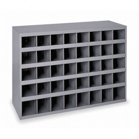 Pigeonhole Bin Unit Overall Depth 12 In. Overall Width 33-3/4 In. Overall Height 23-7/8 In. Bin Depth 11-7/8 In. Bin Width 3-13/16 In. Bin Height 3-3/16 In. Total Number of Bins 40 Color Gray Finish Powder Coated Material Steel