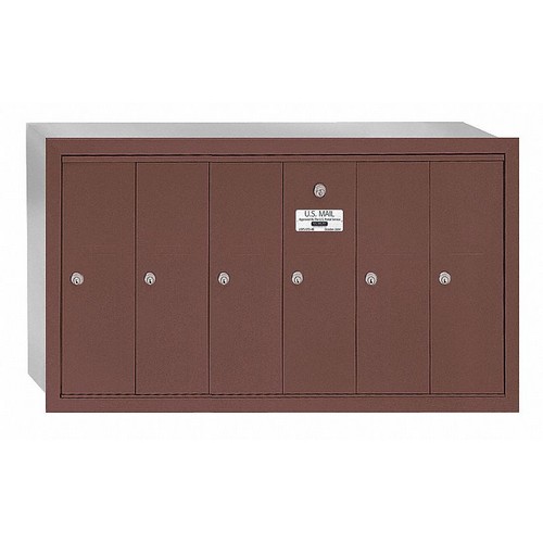 Vertical Mailbox 6 Number of Doors Color Bronze Height 19 In Depth 7 1/2 In Width 35 1/4 In Aluminum Box Material Front Loading Recessed Mounting Door Material Aluminum Powder Coated Finish Net Weight 40 Lb USPS Standards