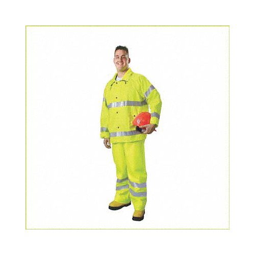 2-Piece Rain Suit with Jacket/Bib Overall High Visibility Yes Rainwear ANSI Class Class 3 Type R 4XL/5XL Yellow/Green Rainwear Features Wind Resistant Rainwear Primary Material PVC Hood Style Attached Hood Included Yes Rainwear Ankle Style Hook-and-Loop Rainwear Closure Type Zipper Rainwear Cuff Style Hook-and-Loop Fits Chest Size 64 in to 66 In. Fits Waist Size 52 in to 54 In. Men's Inseam 32 In. Jacket Length 32-1/2 In. Material PVC Seam Style Double Sealed