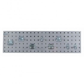 Pegboard Strip Kit Panel Hole Shape Square Overall Height 9 In. Overall Width 31-1/2 In. Overall Depth 9/16 In. Load Capacity 35 lb. Tool Storage Space 2 sq. ft. Swing Radius 0 Panel Hole Size 3/8 In. Panel Hole Spacing 1-1/2 In. Material Steel Color Silver Number of Panels 1 Number of Hooks 8 Epoxy Coated Finish