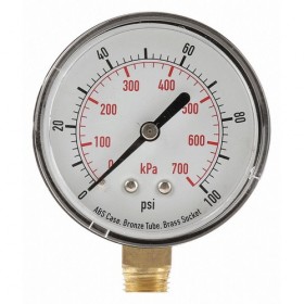 D1343 Pressure Gauge Test 2-1/2 In. Basic Gauge Case Material Plastic Basic Gauge Wetted Parts Brass / Bronze 1/4 In. MNPT Gauge Connection Location Bottom 0 to 100 psi Gauge Secondary Range Units kPa Gauge Secondary Range Values 0 to 700 +/-3-2-3 Percent Gauge Panel Mountable No Liquid Filled No Gauge Primary Range Smallest Graduation 2 Gauge Case Material ABS Plastic Gauge Case Color Black Calibration Certificate Included No