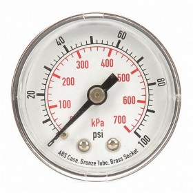D1335 Pressure Gauge Test 1-1/2 In. Basic Gauge Case Material Plastic Basic Gauge Wetted Parts Brass / Bronze 1/8 In. MNPT Gauge Connection Location Center Back 0 to 100 psi Gauge Secondary Range Units kPa Gauge Secondary Range Values 0 to 700 +/-3-2-3 Percent Gauge Panel Mountable No Liquid Filled No Gauge Primary Range Smallest Graduation 2 Gauge Case Material ABS Plastic Gauge Case Color Black Calibration Certificate Included No