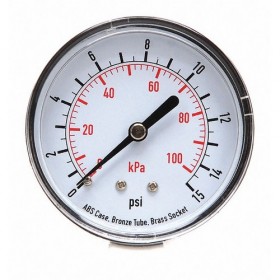 D1344 Pressure Gauge Test 2-1/2 In. Basic Gauge Case Material Plastic Basic Gauge Wetted Parts Brass / Bronze 1/4 In. MNPT Gauge Connection Location Center Back 0 to 15 psi Gauge Secondary Range Units kPa Gauge Secondary Range Values 0 to 100 +/-3-2-3 Percent Gauge Panel Mountable No Liquid Filled No Gauge Primary Range Smallest Graduation 0.5 Gauge Case Material ABS Plastic Gauge Case Color Black Calibration Certificate Included No