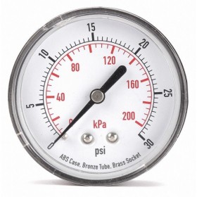 D1344 Pressure Gauge Test 2-1/2 In. Basic Gauge Case Material Plastic Basic Gauge Wetted Parts Brass / Bronze 1/4 In. MNPT Gauge Connection Location Center Back 0 to 30 psi Gauge Secondary Range Units kPa Gauge Secondary Range Values 0 to 200 +/-3-2-3 Percent Gauge Panel Mountable No Liquid Filled No Gauge Primary Range Smallest Graduation 0.5 Gauge Case Material ABS Plastic Gauge Case Color Black Calibration Certificate Included No