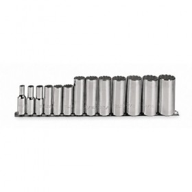 Socket Set Drive Size 3/8 In. SAE Socket Size Range 1/4 in to 1 In. Number of Pieces 13 Std. Socket Point Styles Included None Deep Socket Point Styles Included 12 Flex Socket Point Styles Included None Finish Chrome Standard Tool (Accessory Needed for Tethering) Ratchets Included None Sockets Included 1/4 In. 5/16 In. 3/8 In. 7/16 In. 1/2 In. 9/16 In. 5/8 In. 11/16 In. 3/4 In. 13/16 In. 7/8 In. 15/16 In. 1 In. Standards ASME B107.1 AS954E S3.8.1