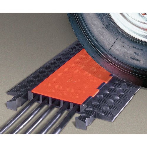 ADA Cable Protector Hinged Material Polyurethane Connection Style Dog Bone Number of Channels 5 Black Orange Cable Protection System Components Length 36 In. Width 19-3/4 In. Height 1-7/8 In. Channel Width 1-1/4 In. Channel Height 1-1/4 In. Load Capacity 10 500 lb./Tire 21 000 lb./Axle Cable Protector For Use With Vehicle and pedestrian traffic. Ideal for amusement parks entertainment venues sporting events industrial construction commercial applications