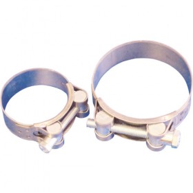 Heavy duty bolt clamps to DIN 3017 are specifically designed to give extremely high band tension for sealing pressure/suction lines with either steel or plastic reinforcement and high shore hardness. Reinforced loops withstand significantly higher torques and the mechanically locked closure has no welding points and therefore no contact corrosion. Bridge gives optimal hose protection and the robust band with rounded edges for protection against injuries and/or damage to the hose surface. W2 material. Band grade 430 stainless steel. Housing/bolt 8.8 grade BZP.