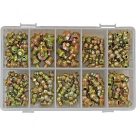 With varying components including straight, 45° and 90° grease nipples with a range of thread sizes, this hydraulic grease nipple kit is an ideal way of having the correct tool to hand. Supplied in a plastic protective case for easy transportation and contains 140 components.