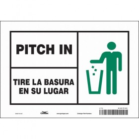 Safety Sign Sign Subject Matter Cleaning and Maintenance Height 7 In. Width 10 In. Sign Material Vinyl Sign Mounting Style Adhesive Surface Header Blank Legend PITCH IN/TIRE LA BASURA EN SU LUGAR Printed Language English Spanish Sign Shape Rectangle
