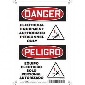 Safety Sign Sign Subject Matter Electrical Hazard Height 10 In. Width 7 In. Sign Material Aluminum Sign Mounting Style With Mounting Holes Header Danger/Peligro Legend Electrical Equipment Authorized Personnel Only/Equipo Electrico Solo Personal Autorizado Printed Language English Spanish Sign Shape Rectangle