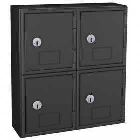 Cell Phone Locker Assembled Locker Configuration (2) Wide (2) Tier Number of Openings 4 Opening Height 5-1/2 In. Overall Width 12 In. Overall Depth 4 In. Overall Height 13-1/2 In. Color Black Locker Material ABS Plastic Finish Matte Legs Included No Locker Handle Type None Locker Door Type Solid Locker Lock Type Keyed Mounting Style Surface