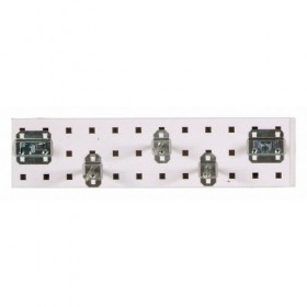 Pegboard Strip Kit Panel Hole Shape Square Overall Height 4-1/2 In. Overall Width 18 In. Overall Depth 9/16 In. Load Capacity 15 lb. Tool Storage Space 0.5 sq. ft. Swing Radius 0 Panel Hole Size 3/8 In. Panel Hole Spacing 1-1/2 In. Material Steel Color White Number of Panels 1 Number of Hooks 5 Epoxy Coated Finish