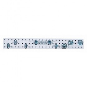 Pegboard Strip Kit Panel Hole Shape Square Overall Height 4-1/2 In. Overall Width 36 In. Overall Depth 9/16 In. Load Capacity 35 lb. Tool Storage Space 1 sq. ft. Swing Radius 0 Panel Hole Size 3/8 In. Panel Hole Spacing 1-1/2 In. Material Steel Color White Number of Panels 1 Number of Hooks 8 Epoxy Coated Finish