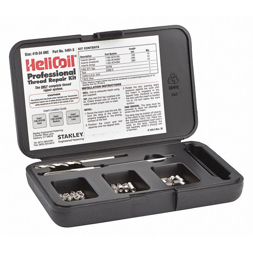 Thread Repair Kit Free Running 304 Stainless Steel Size 10-24 Length 0.285 In Thread Type UNC Number of Pieces 36 For Metal Includes 12 Ea. 0.190 0.285 0.380 In Inserts 1 Each of a Drill High Speed Steel Tap Tang Removal Tool and Installation Tool.