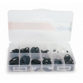 Retaining Ring Assortment E-Style Steel Finish Phosphate Number of Pieces 300 Number of Sizes 9 Includes (50) Each E-25x1/4 In. E-37x3/8 In. (40) Each E-18x3/16 In. E-50x1/2 In. (30) Each E-6x1/16 In. E-12x1/8 In. (20) Each E-62x5/8 In. E-75x3/4 In. E-87x7/8 In. and Plastic Container