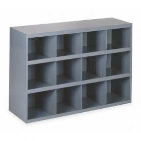 Pigeonhole Bin Unit Overall Depth 12 In. Overall Width 33-3/4 In. Overall Height 23-7/8 In. Bin Depth 11-7/8 In. Bin Width 7-11/16 In. Bin Height 6-1/8 In. Total Number of Bins 12 Color Gray Finish Powder Coated Material Steel