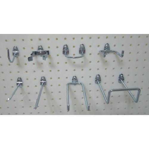 G0588 Sub-Category - Pegboard And Slatwall Accessories Hook Kit Pegboard Hook Assortment Kit Hole Shape Round Mounting Type Screw In Hole Size 1/4 In. Hole Spacing 1 In. Material Steel Color Silver/Yellow Construction Welded Finish Bright Zinc Includes 12 Rods and Clips