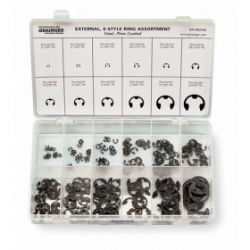 E Style Retaining Ring Assortment Sizes 1/8 to 7/8 Inch 255 Pieces 12 Sizes Steel Phosphate Includes 25 Each E-12 x 1/8 E-15 x 5/32 E-18 x 3/16 SE-21 x 7/32 E-25 x 1/4 SE-31 x 5/16 E-37 x 3/8 E-43 x 7/16 and E-50 x 1/2 10 Each E-62 x 5/8 E-75 x 3/4 and E-87 x 7/8 Meets/Exceeds QS-9000/ISO 9002 MS ANSI and Din Specifications