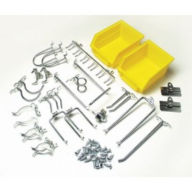 Sub-Category - Pegboard And Slatwall Accessories Hook Kit Hooks And Hanging Bins Hole Shape Round Mounting Type Screw In Material Steel Color Silver/Yellow Rod Thickness 3/16 and 1/4 In. Construction Welded Finish Bright Zinc Locking System Yes Includes Assorted Hooks Bins